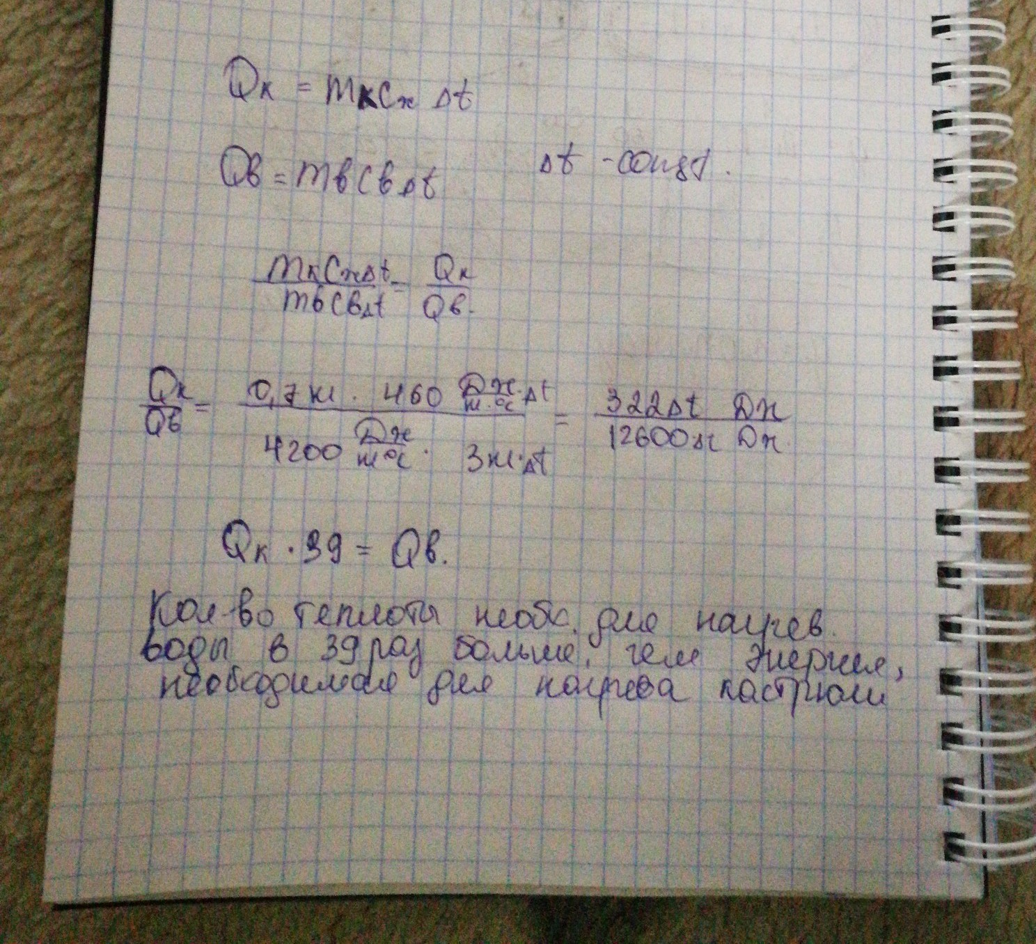 количество теплоты необходимая для нагрева воды 39 раз больше, чем энергия, которая необходима для нагрева кастрюли