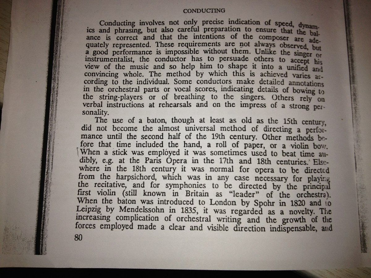 The use of baton, though at least as old as the 15th century, did not become the almost universal method of directing a performance until the second half of the 19th century. Other methods before that time included the hand, a roll of paper, or a violin bow. When a stick was employed it was sometimes used to beat time audibly, e.g. at the Paris Opera in the 17th and 18th centuries. Elsewhere in the 18th century it was normal for opera to be directed from the harpsichord, which was in any case necessary for playing the recitative, and for symphonies to be directed by the principal first violin (still known in Britain as “leader” of the orchestra). When the baton was introduced to London by Spohr in 1820 and to Leipzig by Mendelssohn in 1835, it was regarded as a novelty. The increasing complication of orchestral writing and the growth of the forces employed made a clear and visible direction indispensable, and