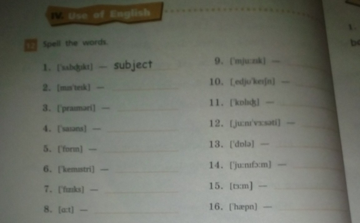 2)mistake 3)primary 4)silence 5) form 6) chemistry. 7)physics 8)art. 9)music. 10) education. 11)college 12) university. 14)uniform 15)team 16) happen.