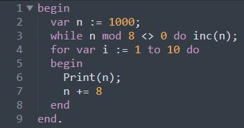Напишите программу, которая ищет первые 10 натуральных чисел, которые кратны 8, начиная от 1000