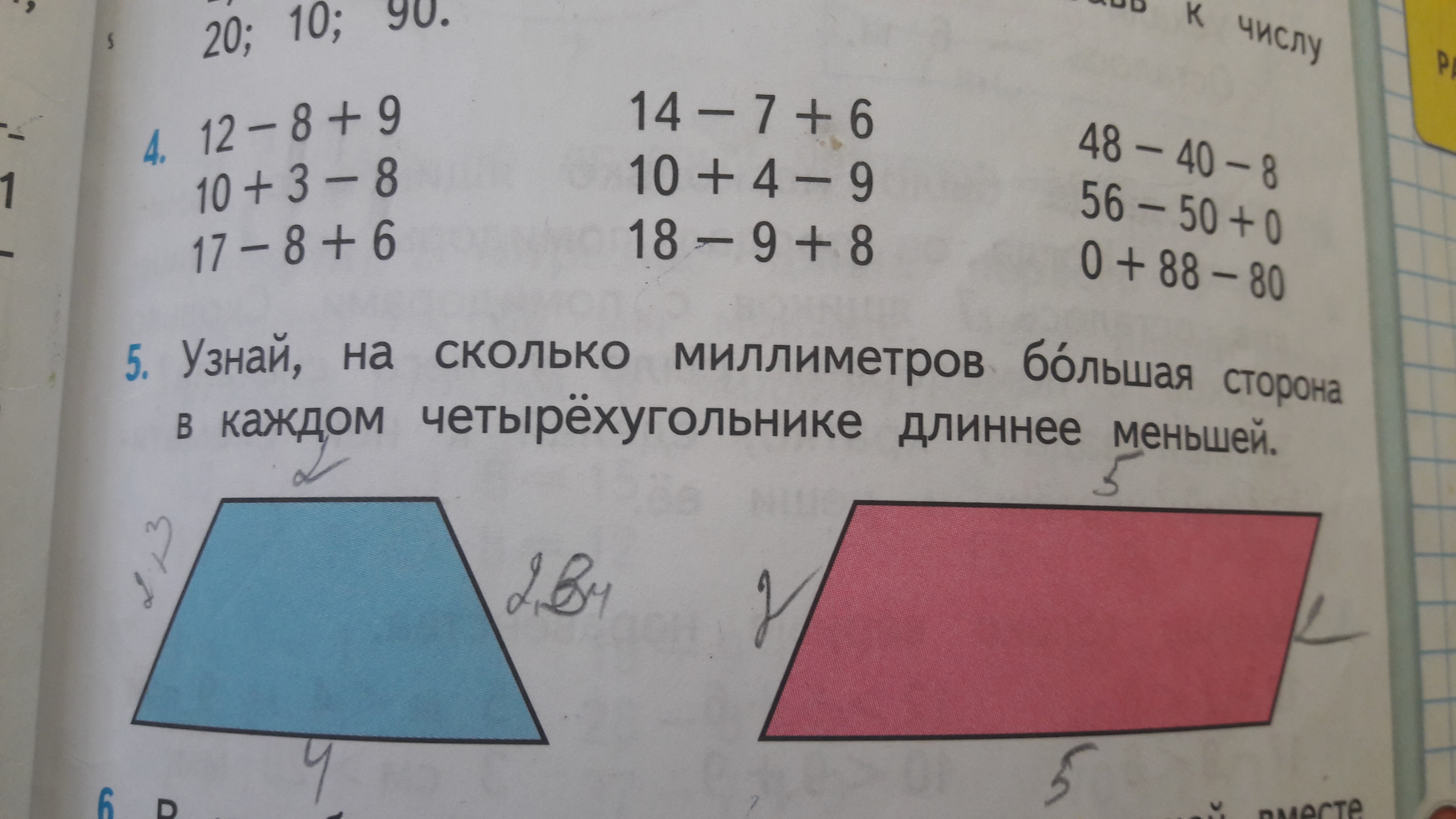 Перевести см в мм и вычесть из бОльшей стороны четырёхугольника меньшую
