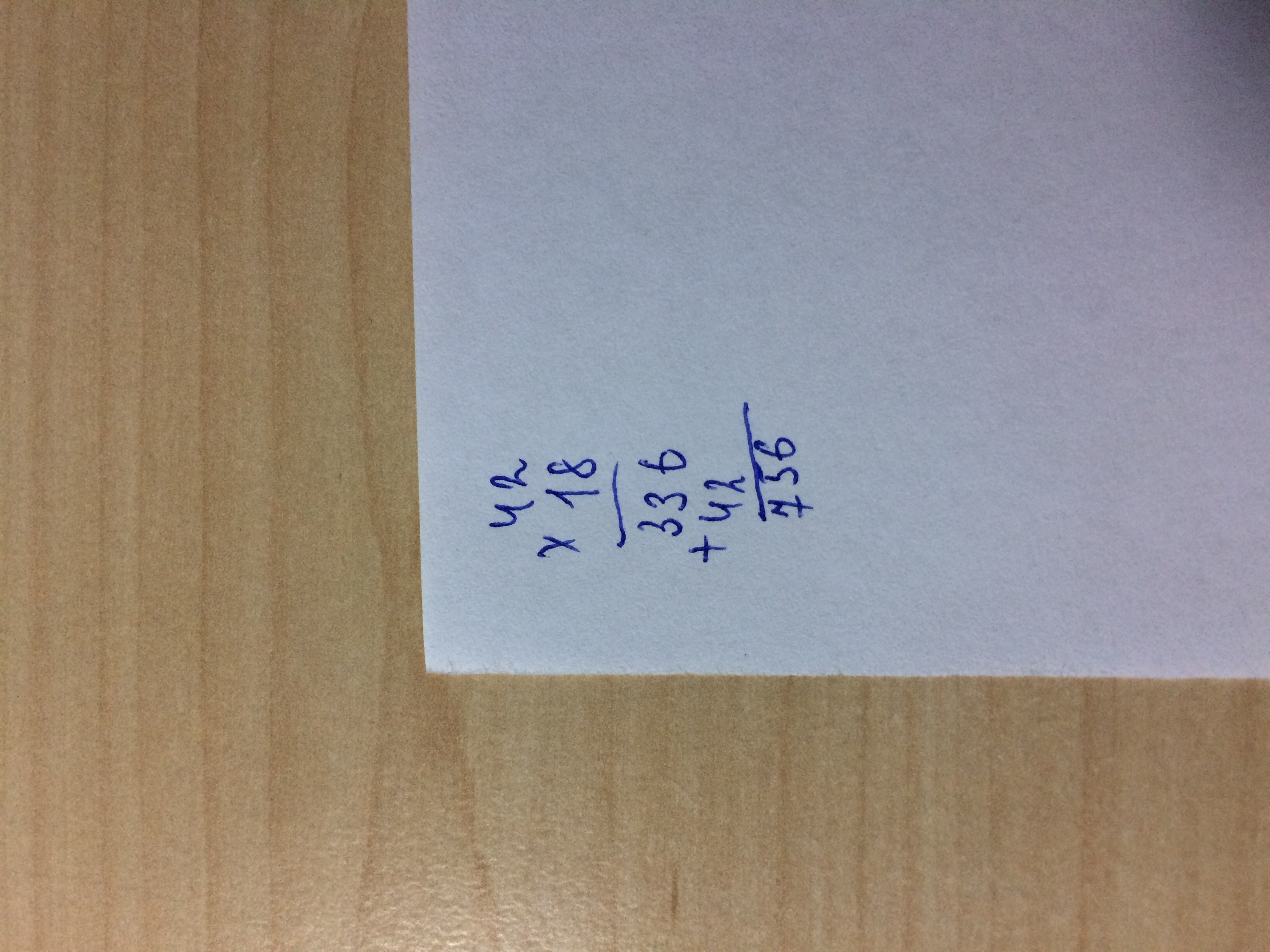 42 умножаешь на 18 сначала 2 на восемнадцать пишешь после дроби 36 потом плюс в углу возле 3 потом 4 на восемнадцать и также