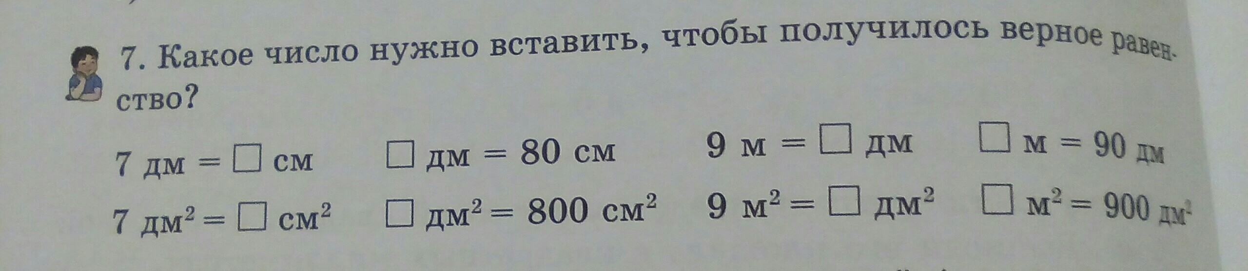 7дм = см 7дм2 = см2 дм =80 см дм2= 800см2 9м = дм2 м =90 дм м2 = 900 дм2 Помогите решить !!!