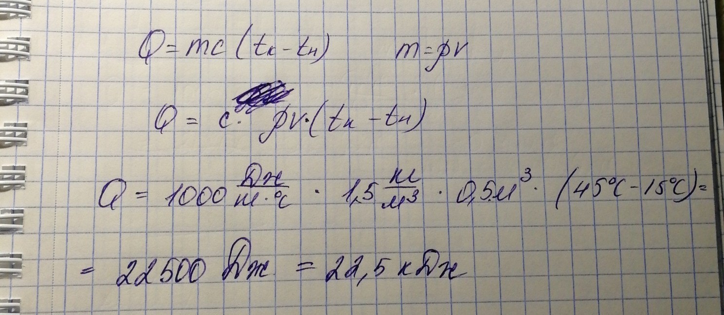 Удельная теплоёмкость углекислого газа 1000дж/м с. Какое кол-во теплоты потребуется для нагревания 0,5 м3 углекислого газа от 15С до 45С если плотность углекислого газа 1,5 кг/м3