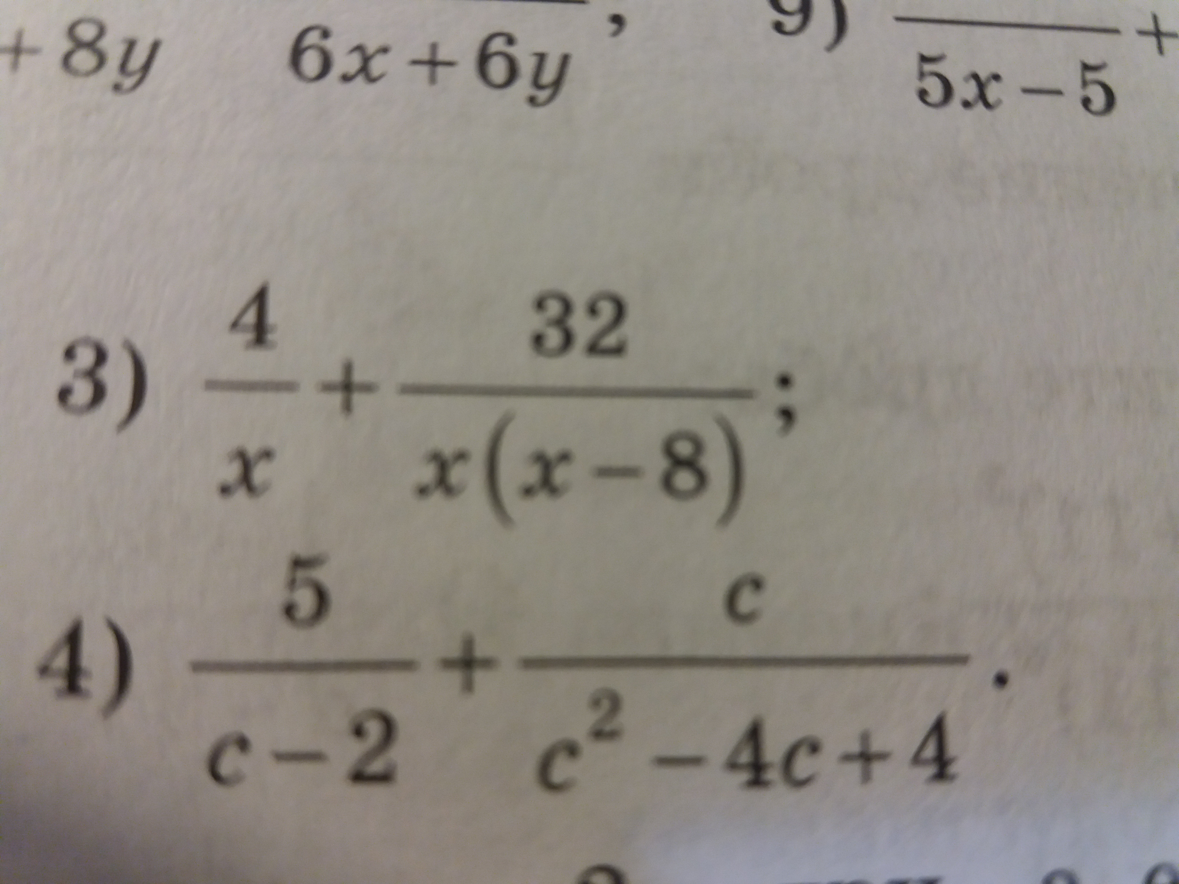 frac{5}{c-2} +frac{c}{c^{2}-4c+4 } =frac{5(c-2) }{(c-2)^{2} } +frac{c}{(c-2)^{2} } =frac{5(c-2)+c}{(c-2)^{2} } =frac{5c-10+c}{(c-2)^{2} } =\ \ =frac{6c-10}{(c-2)^{2} }