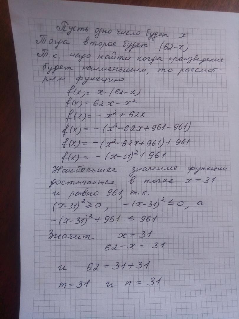 сумма положительных чисел m и n равна 62.При каких значениях m и n их произведение будет наибольшим?