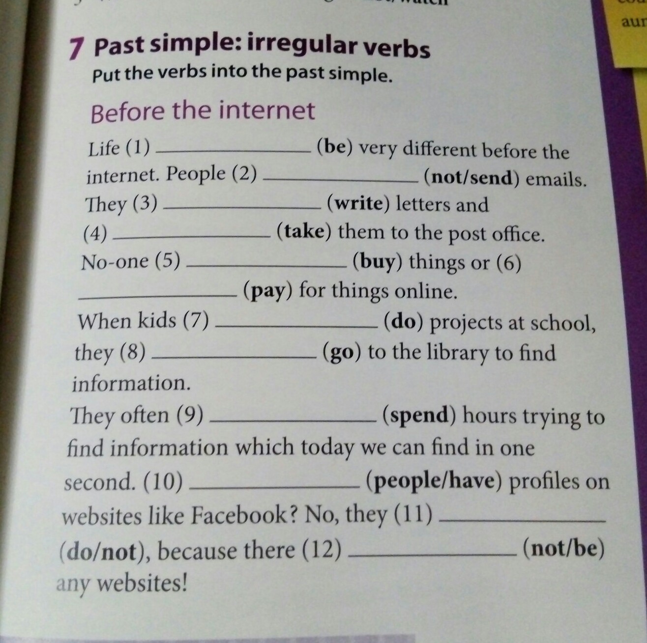 1. was 2. didn't send 3. wrote 4. took 5. bought 6. paid 7. did 8. went 9. spent 10. did people have profiles on websirte like facebook? 11. didn't 12. weren't