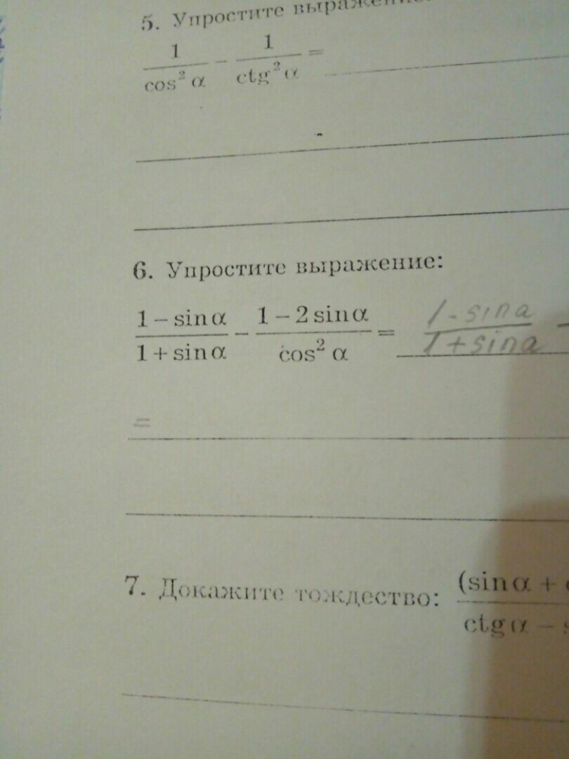 ((1-sinx)²/cos²x)-(1-2sinx)/cos²x=(1-2sinx+sin²x-1+2sinx)/cos²x=sin²x/cos²x=tg²x.