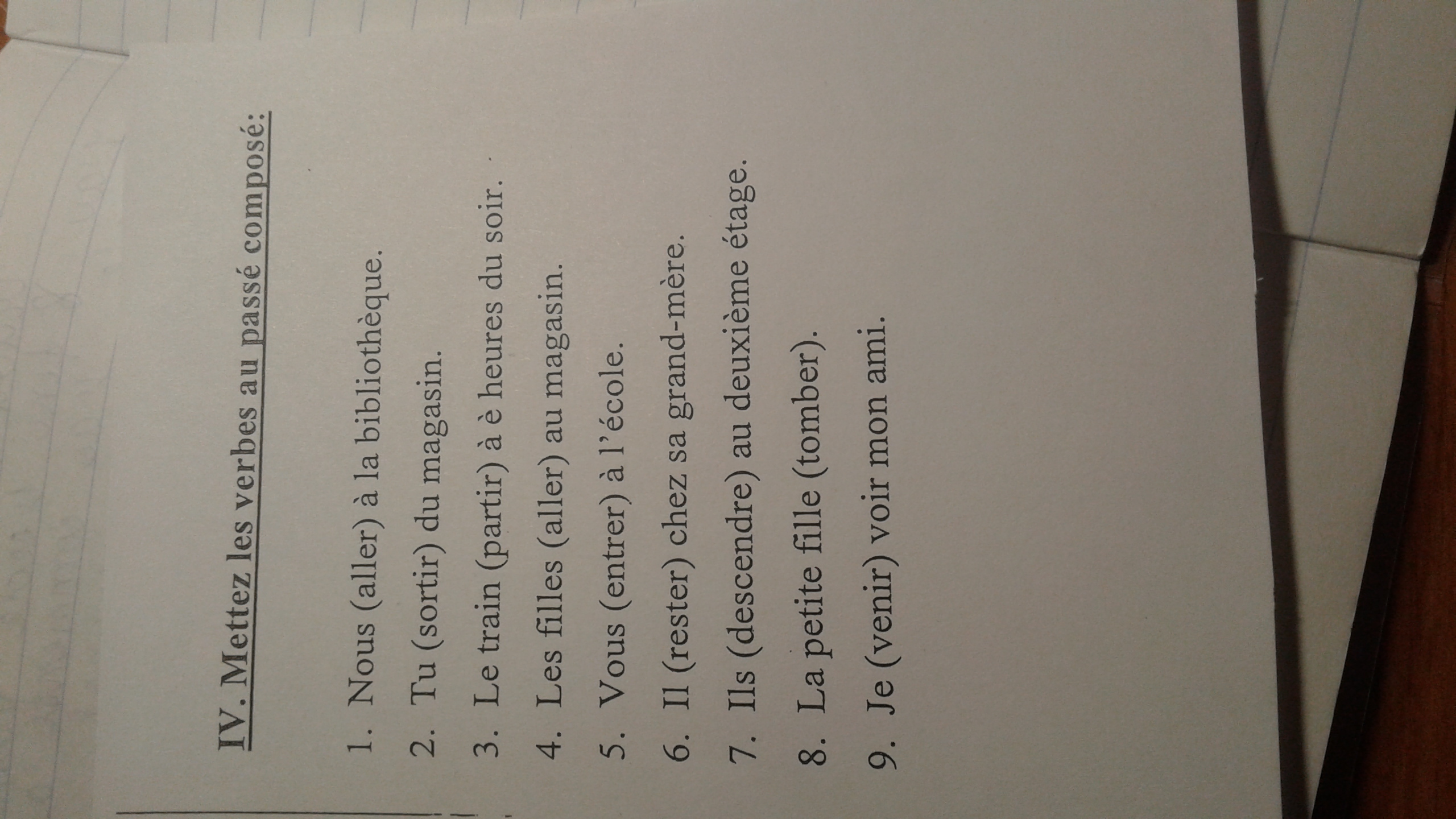 nous sommes, tu es sorti, sont partis, sont allés, êtes entrés, est resté, ont descendu, est tombé, suis venu.