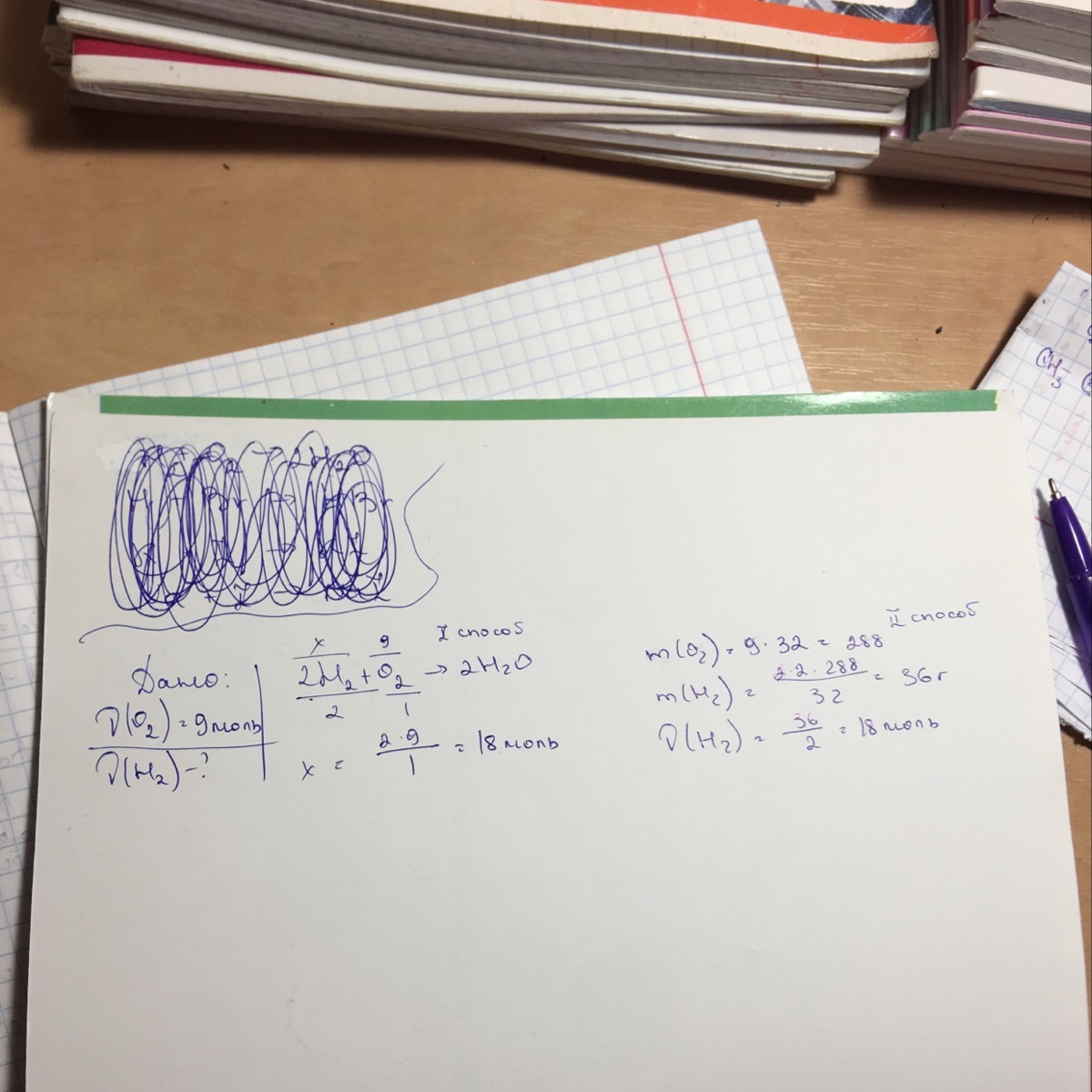 при сгорани водорода в кислороде образуется вода. Какое химическое количетсво: воды образуется если в реакцию вступит кислород химическим количеством 9 моль