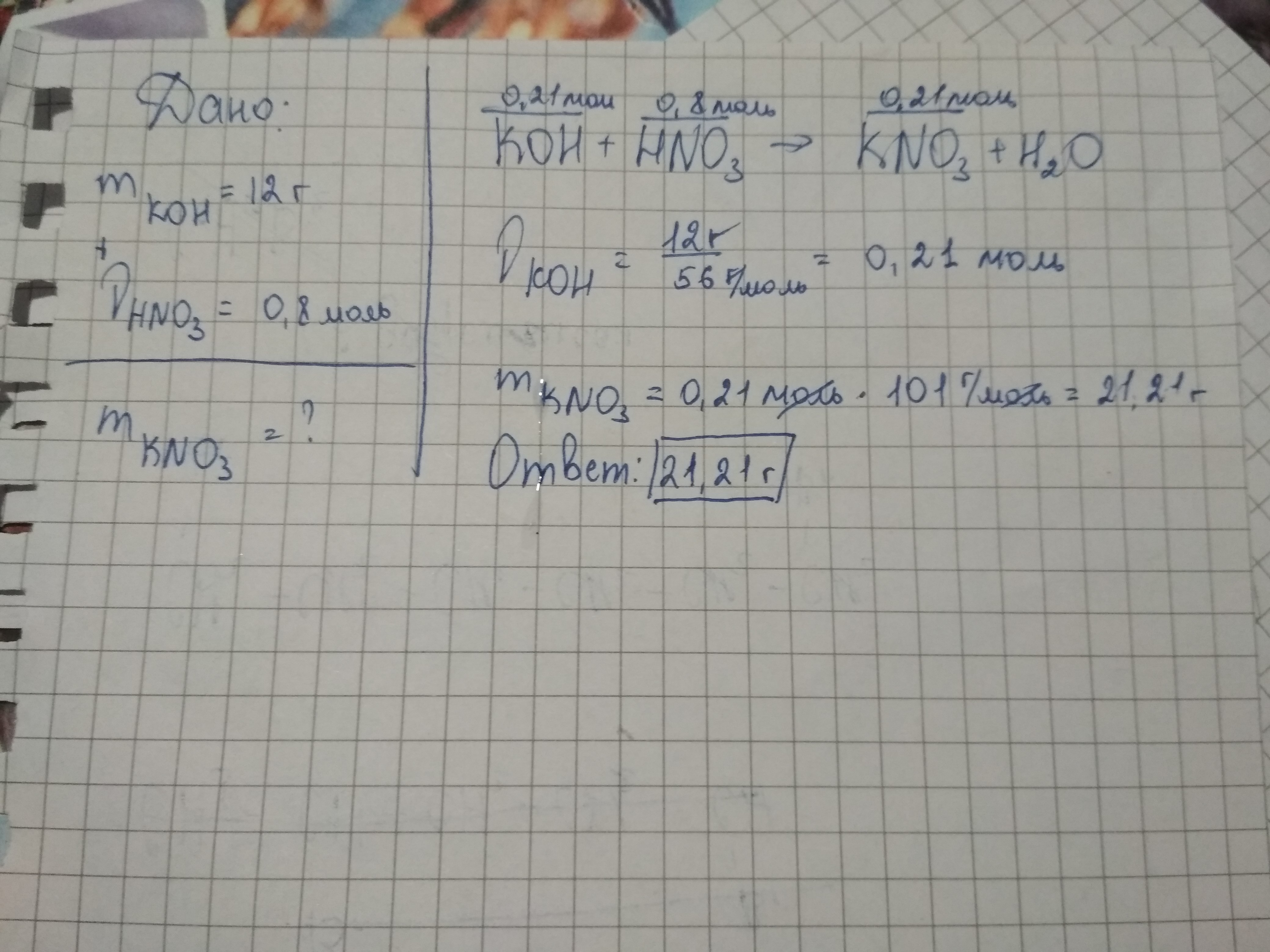 Сколько Грамм 100 ли может выделиться при взаимодействии 12 г гидроксида калия и 0,8 моль азотной кислоты