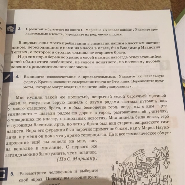 Словосочетания с прилагательными: мохнатый ранец (начальная форма - мохнатый), седой барсучьей щетиной (нач. ф. седой, барсучий), серую шинель (нач. ф. серый), светлых пуговиц (н. ф. светлый), старшего брата (н.ф. старший), о школьных новостях (н.ф. школьный), старого, заправского гимназиста (н.ф. старый, заправский), гимназическое обмундирование (н.ф. гимназический).