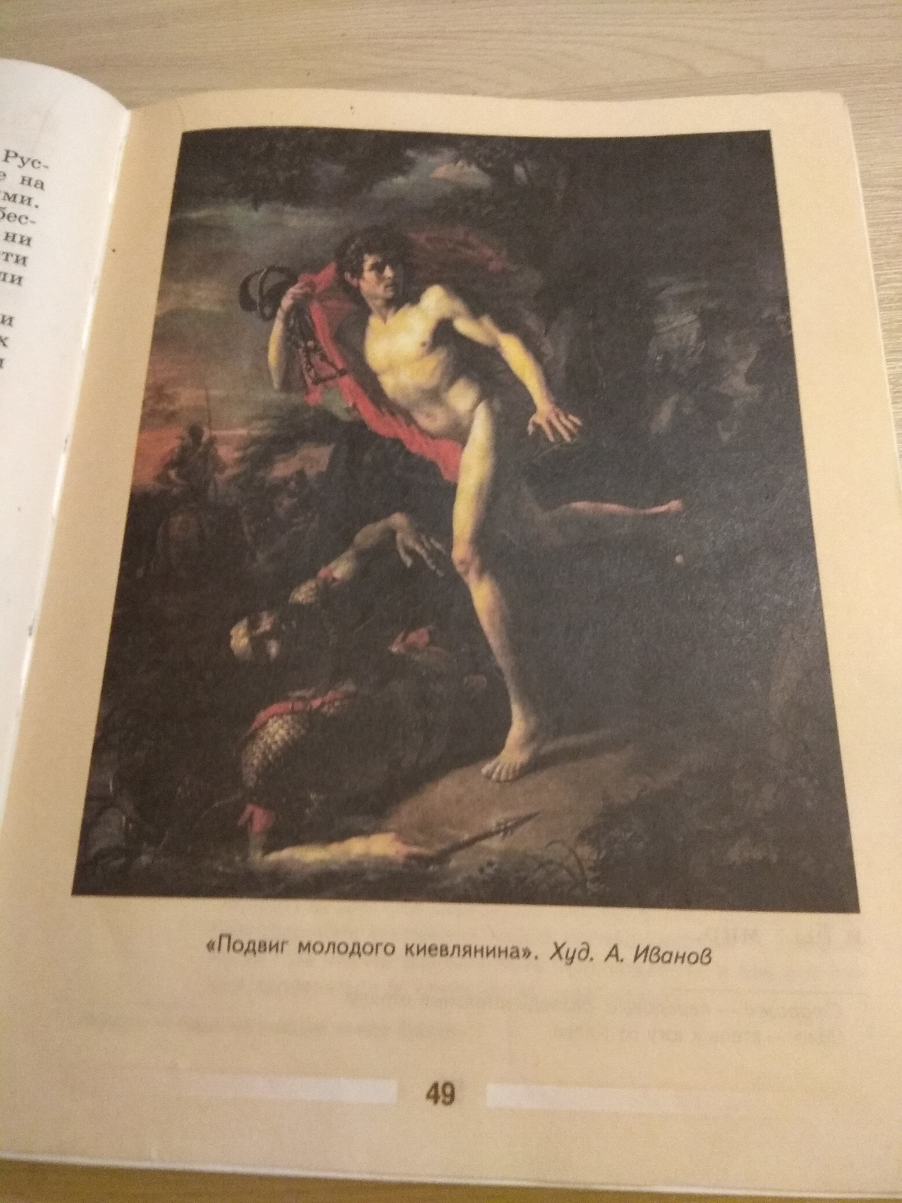 человек, который решился помочь всему киевскому народу. Ему нужно было достичь той стороны Днепра, чтобы попросить о помощи, поскольку печенеги окружили город Киев. На картине видно, что киевлянин без одежды. Достигнув реки, он, скинув одежду, бросился в Днепр и поплыл. За ним была погоня, и в подтверждение тому, мы видим на картине темных всадников. Киевлянин оглядывается в страхе назад, но ему удается спастись. Благодаря ему, Киев получил помощь. На картине отрок выглядит отважным и решительным, настоящим героем.
