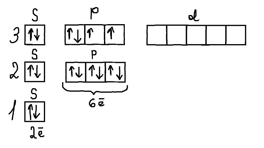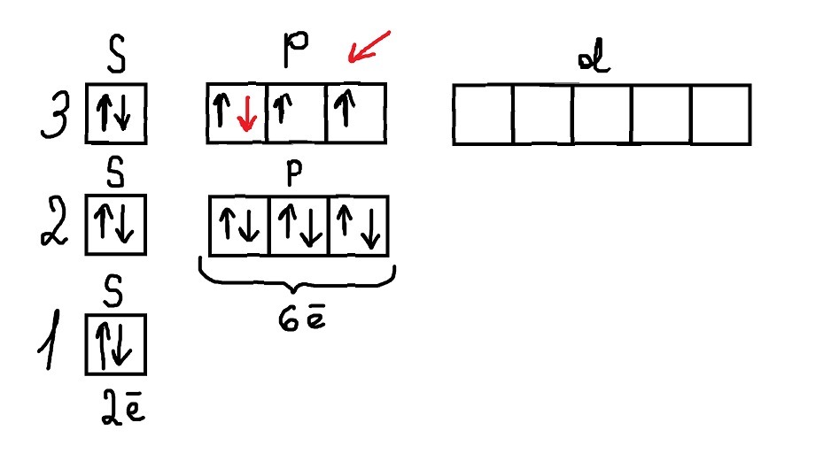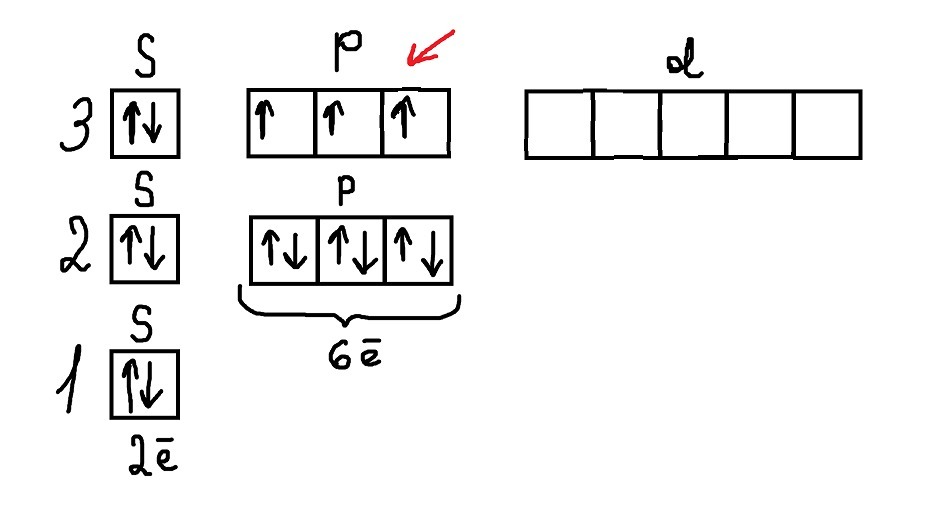 То есть как на фото 2. Сначала мы на 3p подуровне (на котором максимальное кол-во электронов 6) пишем по одной стрелочке, в итоге у нас остается 1 электрон (так как на третьем уровне у нас 6 электронов всего, и 2 из них на 3s подуровне) и мы их начинаем спаривать (фото 3).