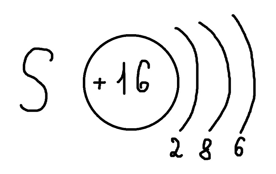 Порядковый номер 16, значит заряд ядра +16, и, получается, 16 электронов.