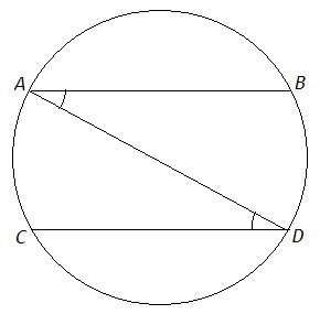Вписанные углы ADC и BAD равны, т.к. опираются на равные дуги. Накрест лежащие углы равны - прямые параллельны.