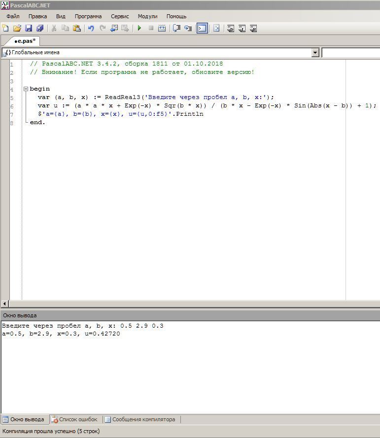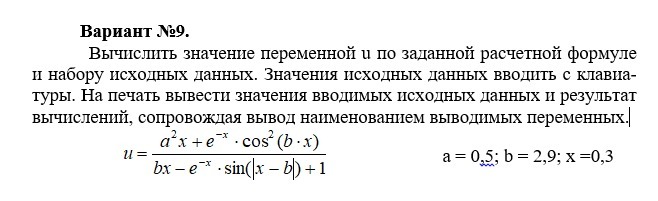 Вычислить значение переменной u по заданной расчетной формуле и набору исходных данных. Значения исходных данных вводить с клавиатуры. На печать вывести значения вводимых исходных данных и результат вычислений, сопровождая вывод наименованием выводимых переменных.