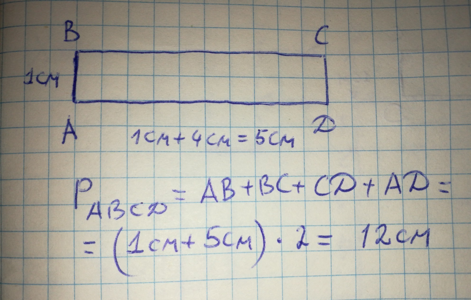 Помагите пожалуйста решить.Начерти прямоугольник,ширина которого 1 см,а длина на 4 см больше.Найди его периметр