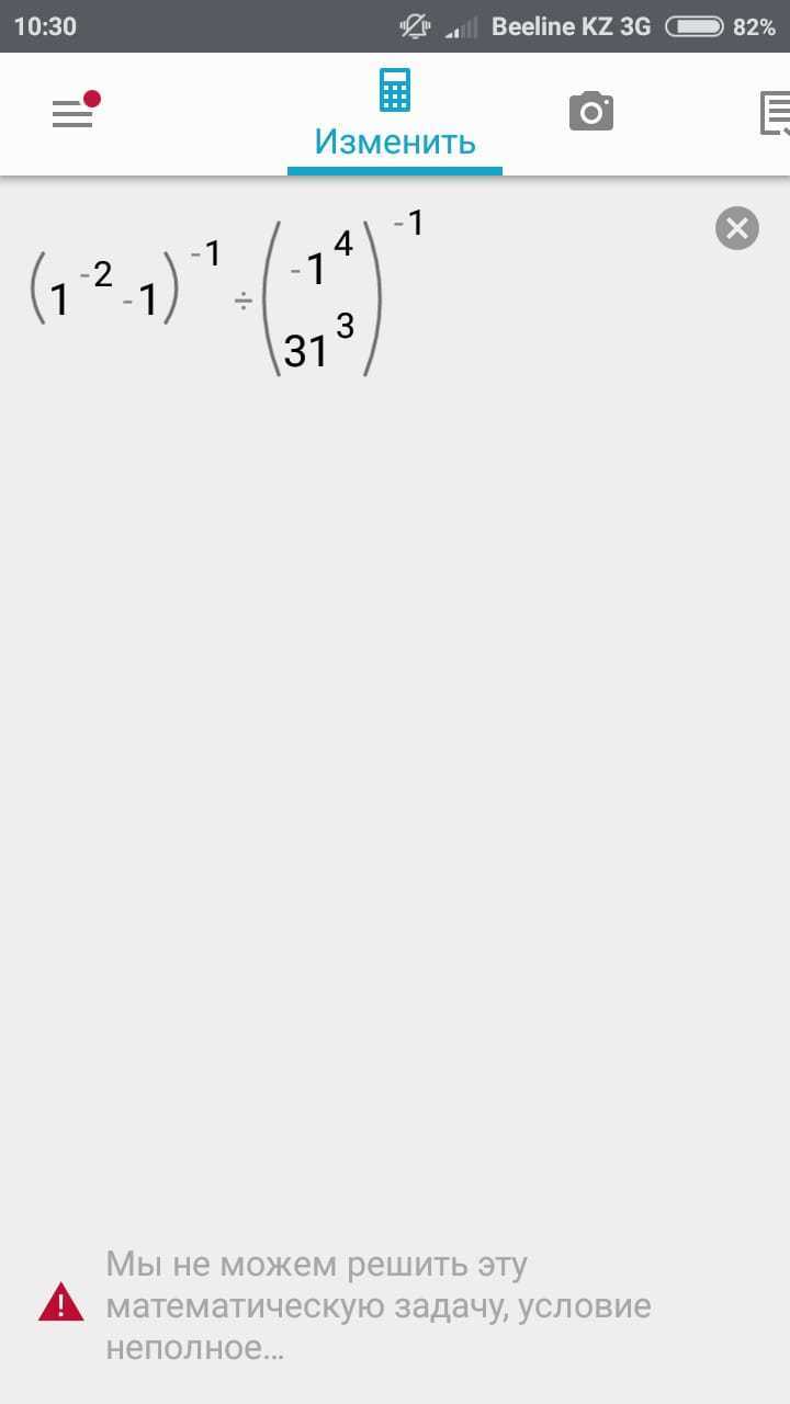 Big (1^{-2}-1Big )^{-1}div Big (frac{-1^4}{31^3}Big )^{-1}=Big (frac{1}{1^2}-1Big )^{-1}, :, Big (frac{-1}{31^3}Big )^{-1}=0, :, Big (-frac{31^3}{1}Big )=\\=0, :, (-31^3)=0