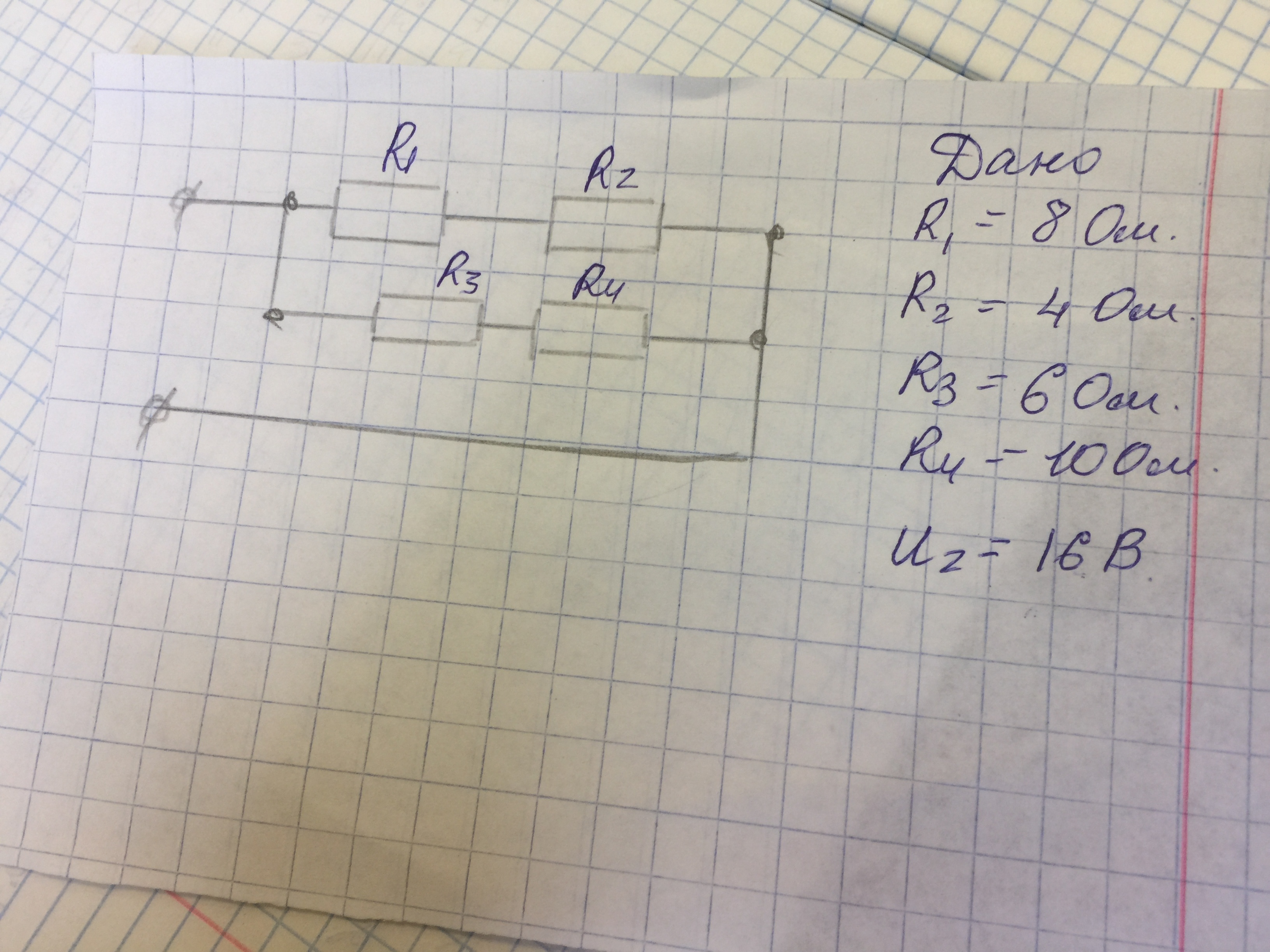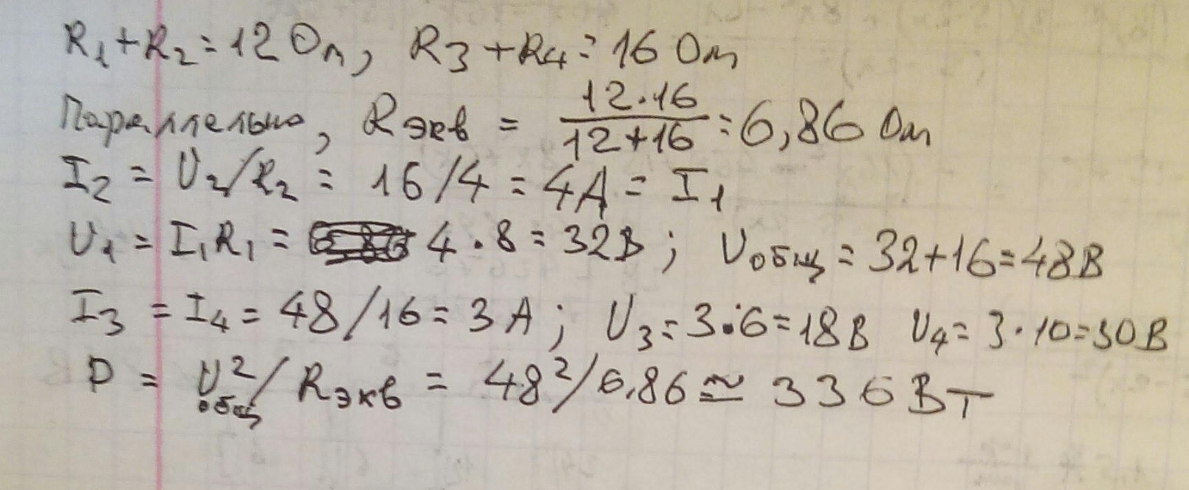 Определить эквивалентное сопротивление цепи и напряжение на сопротивление.Общее напряжение цепи и мозность потребителя цепи