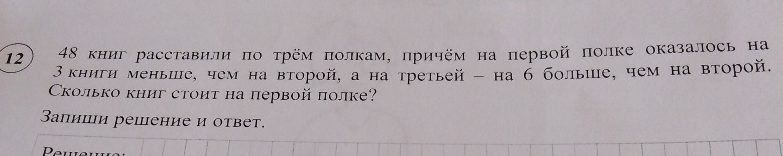 3) 48 - 12 = 36 книг поровну на трёх полках