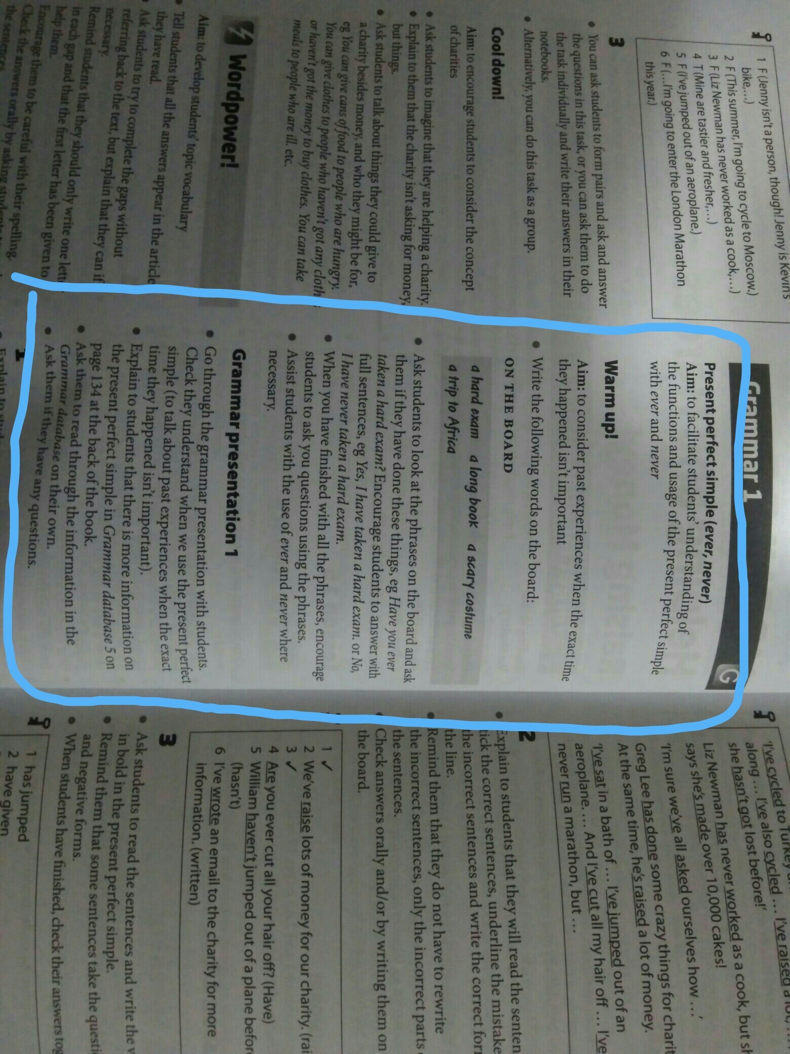 Пишите на доске - a hard exam, a long book, a scary costume,a trip to Africa. И задаёте вопросы классу , употребляя Present Perfect- have you ever taken a hard exam ? Have you ever read a long book? Have you ever worn a scary costume? Have you ever had a trip to Africa? Обращаете внимание учеников , что на вопрос Нужно отвечать развёрнуто, употребляя глагол в Present Perfect . После такого как ученики ответили на вопросы, меняетесь, они задают вопросы Вам , Вы даёте свои развёрнутые ответы.