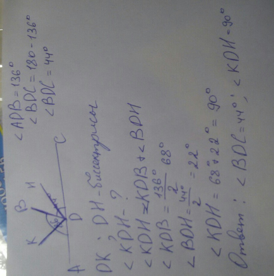 Один из смежных углов равен 136 градусам . Найдите а) второй угол б) угол между биссектрисами этих смежных углов