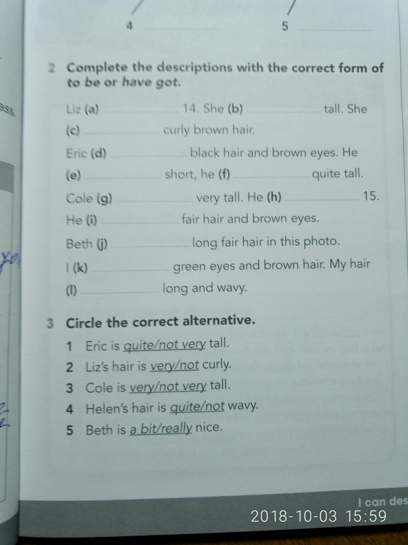 3) Liz is 14. She is tall. She has got curly brown hair.