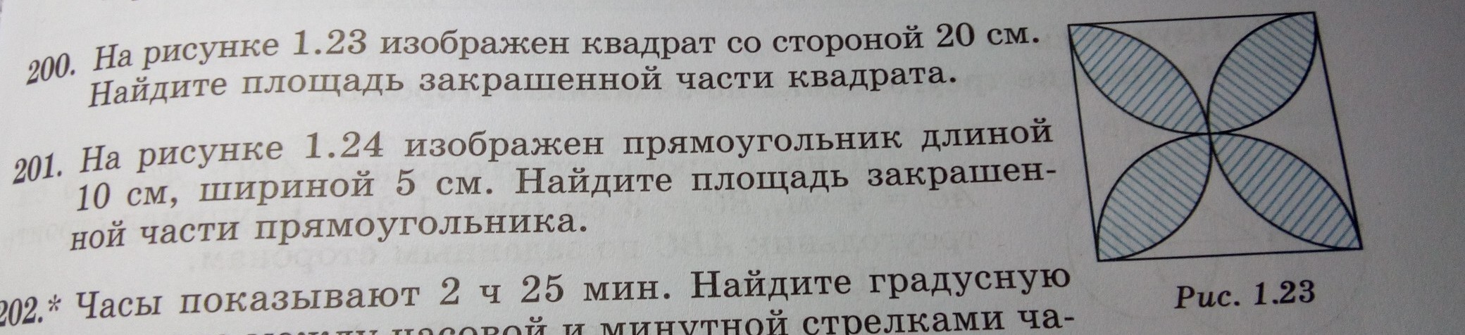 Квадрат состоит из четырех пересекающихся полукругов с диаметром 20 см. Площадь одного полукруга: