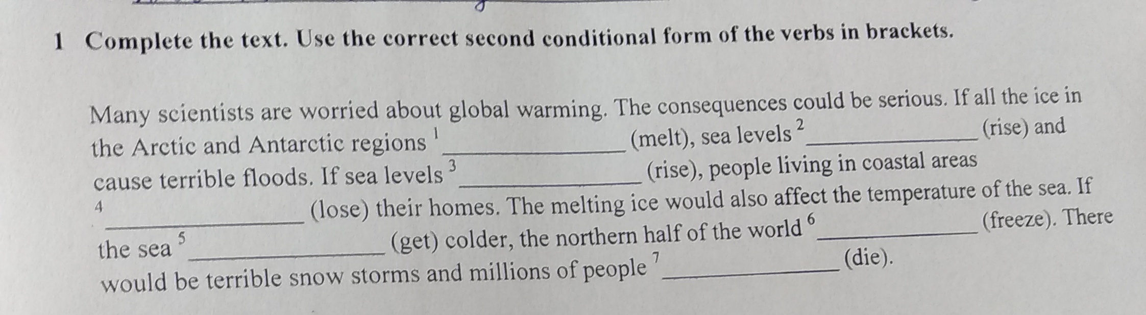 1 melted 2 would rise 3 rose 4 would lose 5 got 6 would freeze 7 would die
