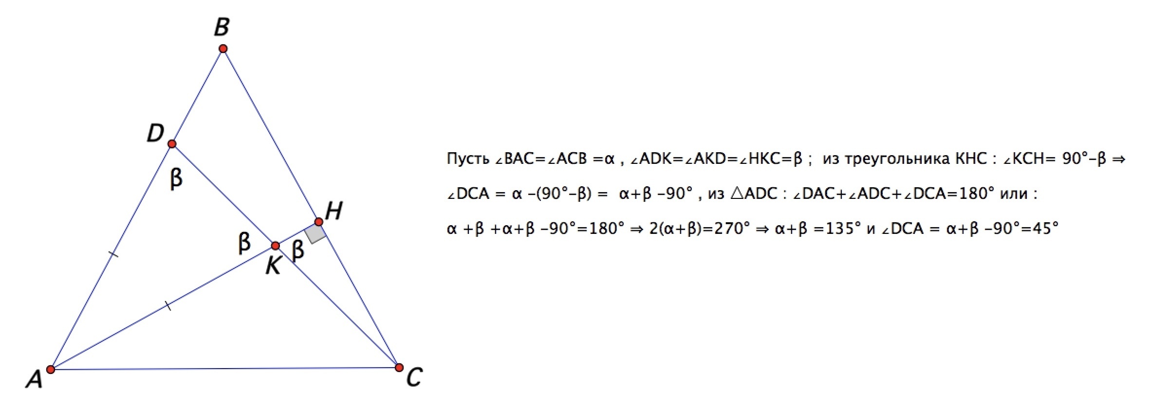 . Высота АН пересекает С в точке К. Причем АД=АК. Найти угол ДСА