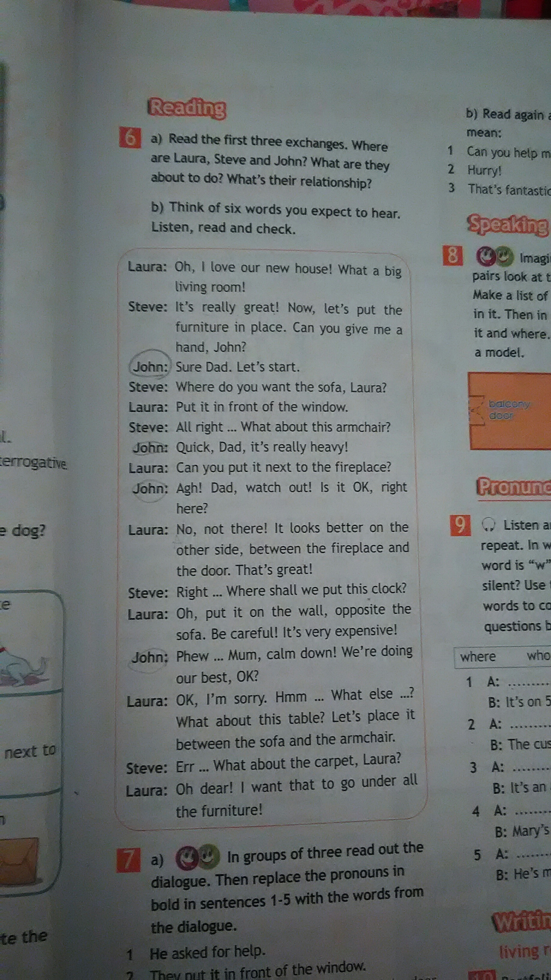 Чтение прочитанных первых трех обменов. Где Лаура, Стив и Джоут Что они собираются сделать? Каковы их отношения? Bi Прочитайте apin ean b) Подумайте о том, что вы хотите услышать. Sododng Слушайте, читайте и проверяйте блокировку 8 00 магнитов в Laura: Ch, я люблю наши теперь bouse! Стивен: Это настоящая жадность. Теперь давайте поместим мебель в пиасе. Вы можете мне помочь, Джон? это и когда-то модель, Johnc Sure Dad. Стенд Стив: Где вы хотите диван, Лаура Лора: Положите это на бой с Стивом: Все в порядке ... W + st о the amdhair? Jahic Quick, Dad, Это действительно тяжелая Лаура: Можете ли вы поставить ее рядом с парнем папы Jahrc Aght, смотреть, что это O, rightrcnu erel dog? Лаура: Нет, не там! Он запирает сливочное масло, а другой - между frepluce и he coux. Это приветствует repert. В слове «wllent? Uha words toc Steve: Righ ... Когда мы поставим это часы Лаура: Ch, положите его на стену, напротив John Phew.Mun, успокойтесь. Мы делаем Laura: CK, I «извините, HmmWhat ese - o're делаем все, что лучше, OK 1 A: что стоит в этом столе? Давайте поместим его рядом с диваном в кресло B: Рядом со Стивом: Err- Что за ковер, Laurn Laura: Ch дорогой, я хочу, чтобы это было под всем B: Это мебель 4 A из 5 A: a) 3AKPblTb от бо-де-1. Он попросил выпить Thntit в шторме окна