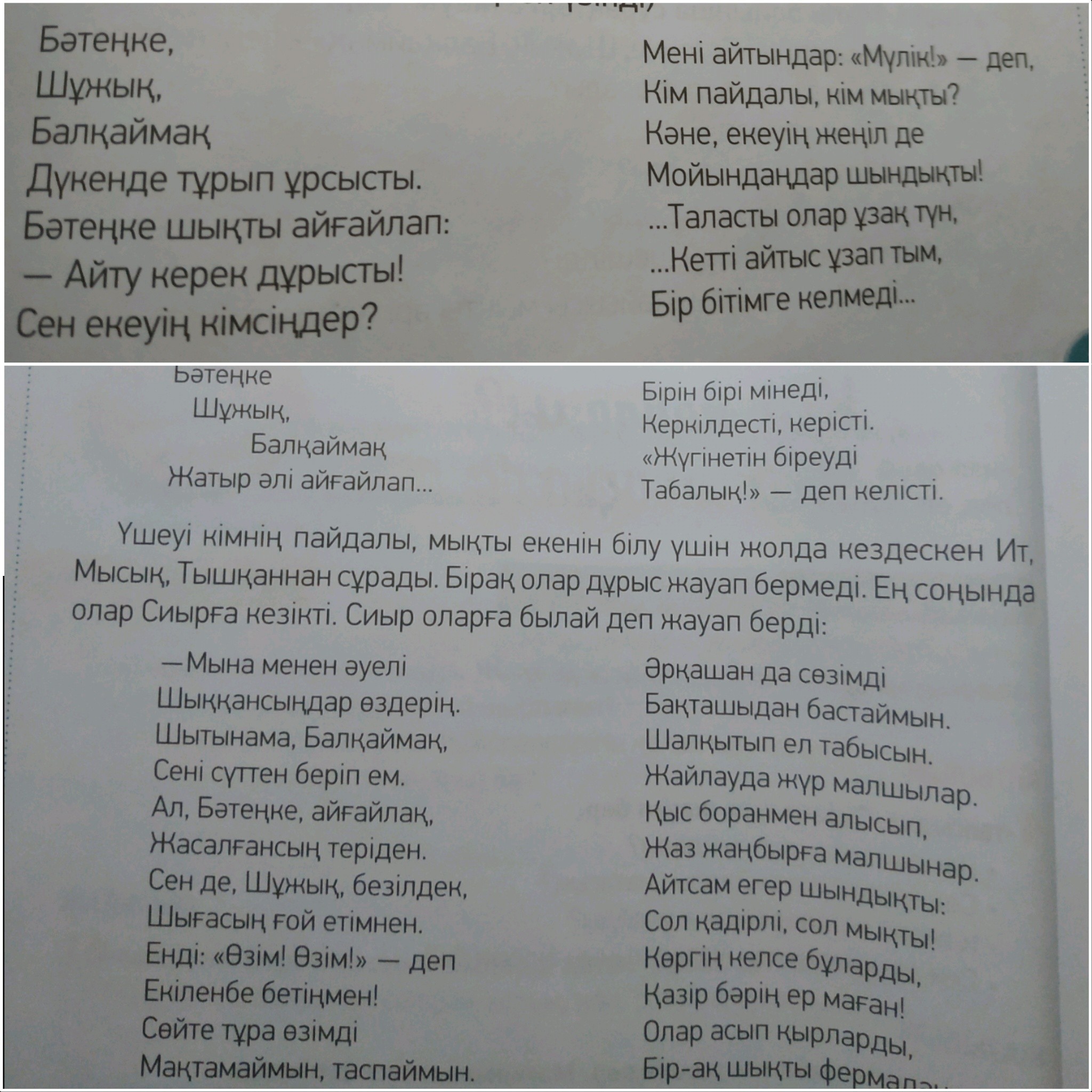 Бұл Бәтеңке, Шұжық, Балқаймақтың дүкенде өзара ұрысып, кімнің пайдалы екенін анықтау туралы өлеңі. Олар Ит, Мысық, Тышқаннан дұрыс жауап естімегесін, Сиырды кездестіреді. Сиыр оларга, Бәтенкенің теріден,Шұжықты еттен, ал Байқаймақты сүттен алынатынын айтады. Ал олардың бәрін алу үшін, бақташының күндіз–түні бойы жұмыс істейтінін алға тартты.