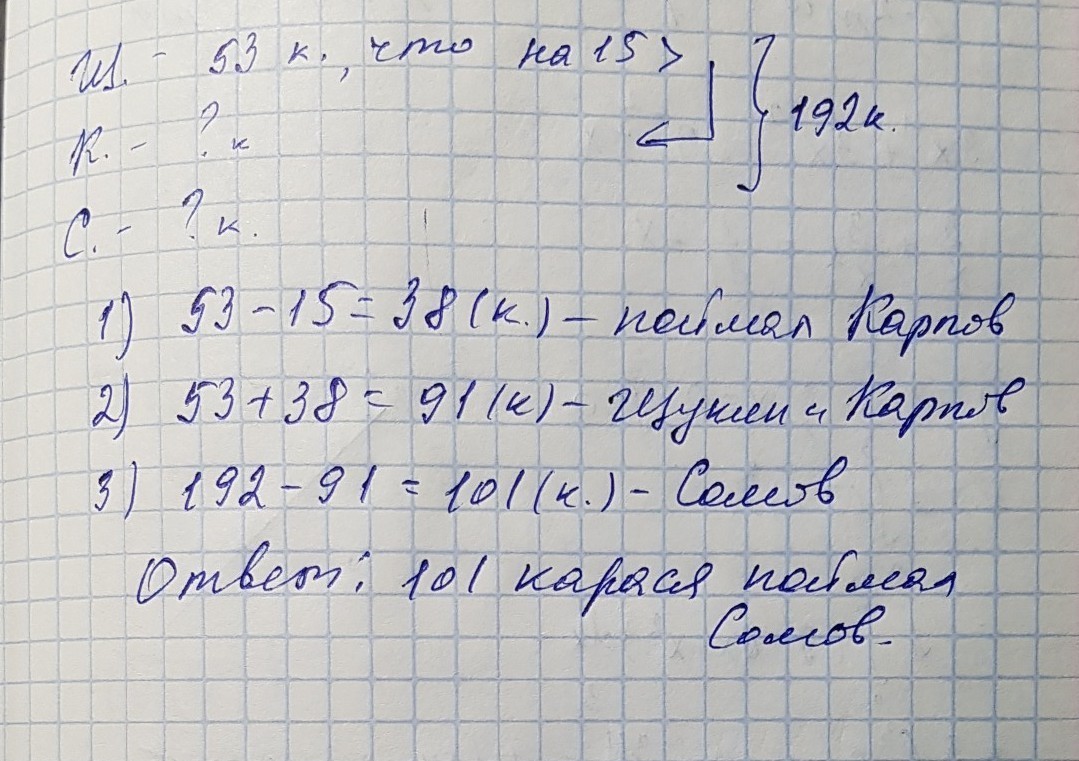Щукин Карпов и сомов Отправились на рыбалку вместе они поймали 192 карася причем Щукин поймал 53 карася что на 15 больше чем поймал Карпов сколько карасей поймал Самсонов