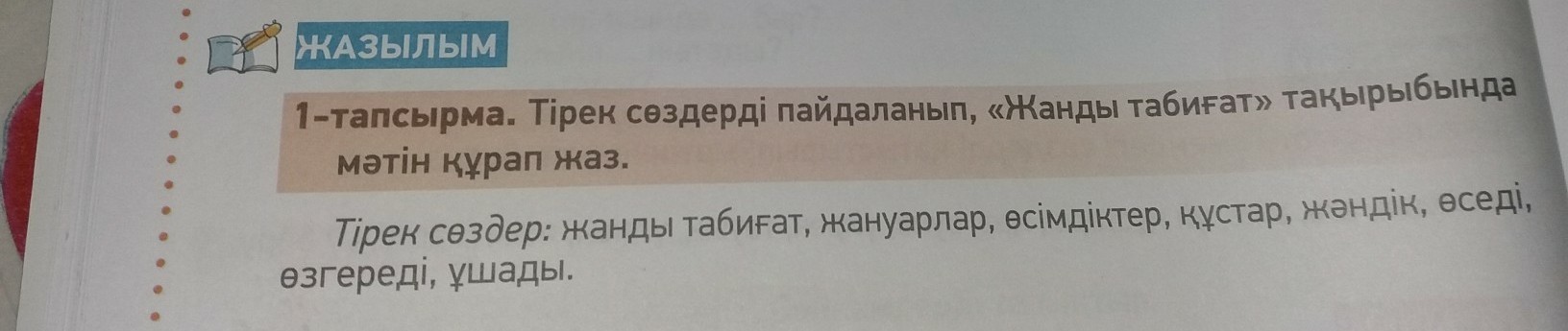 Жанды табиғатқа үңіліп қарасаң ол өте керемет. Жануарлар өздеріне көрік табады . Ал өсісдіктердің қаншама пайдасы бар десеңші . Аспанда құстар ұшып жүреді. Жəндіктерді байқайға болады. Бұтақтардан тал өседі. Жаңбвр болып жатқан жерінен күн шуағы шығып өзгереді.Құстар ұшатынын тамашалау ерекше қызық деп ойлаймын . Маған жанды табиғатты бақылаған ұнайды