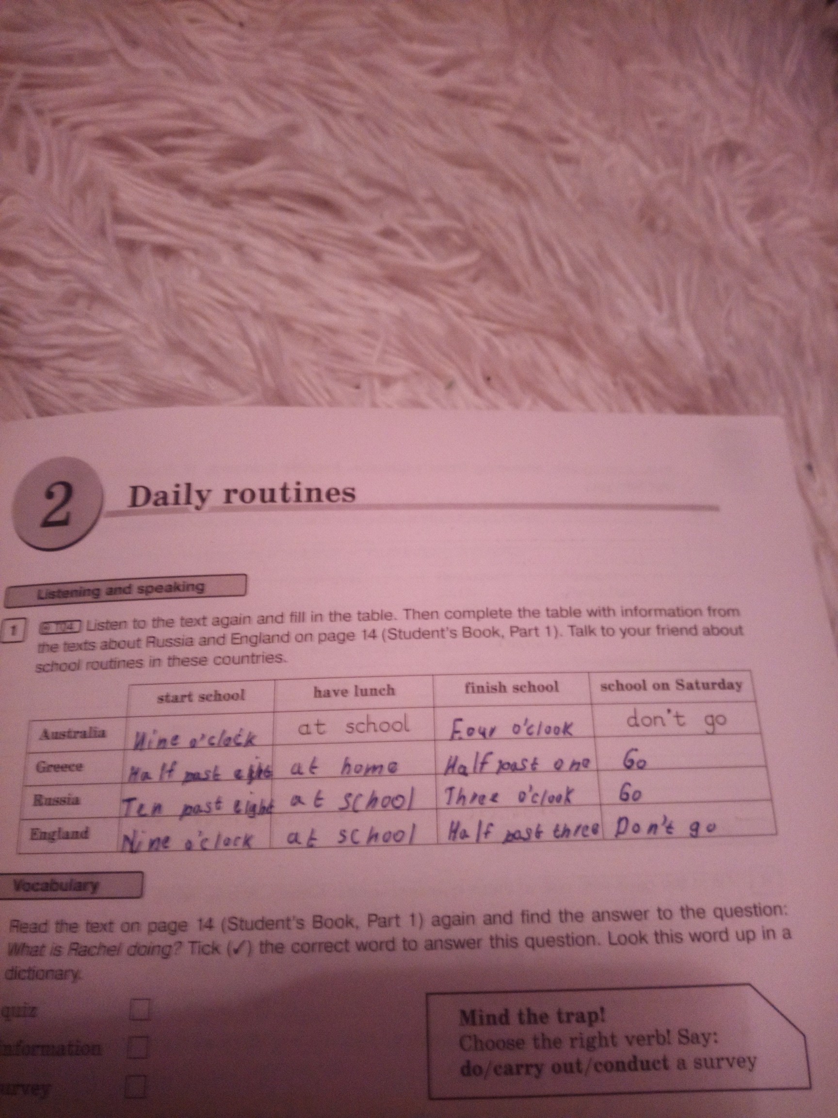 1. When does the school day start in Australia. - In Australia the school day starts at nine o'clock.