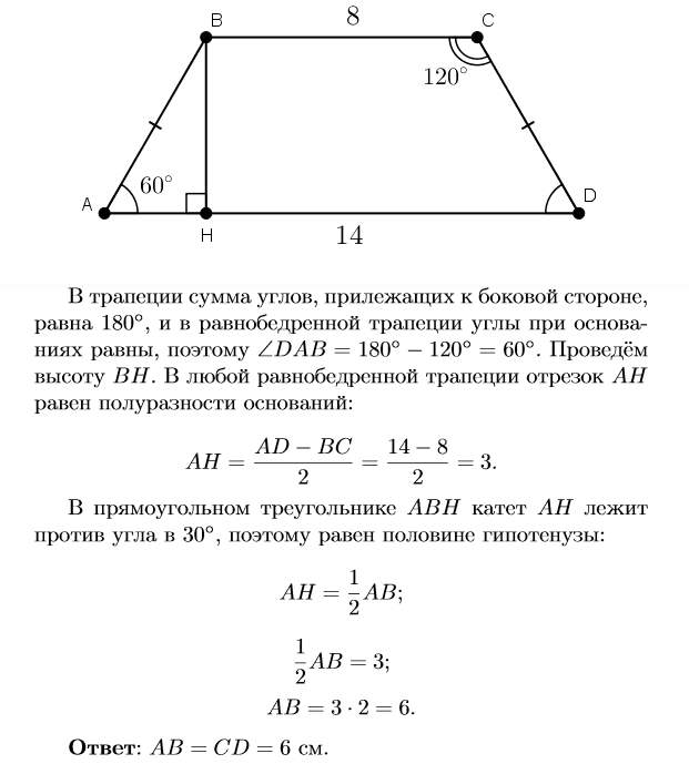 Найдите боковые стороны ровнобедренной трапеции если основание ровняется 14см и 8см а один из углов 120 градусов