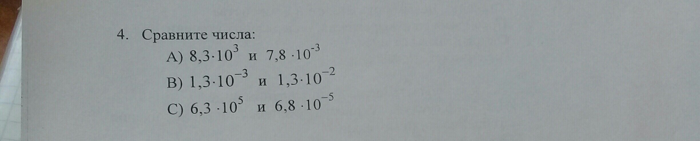 а). 8,3*10^3>7,8*10^-3; б). 1,3*10^-3<1,3*10^-2; с). 6,3*10^5>6,8*10^-5.