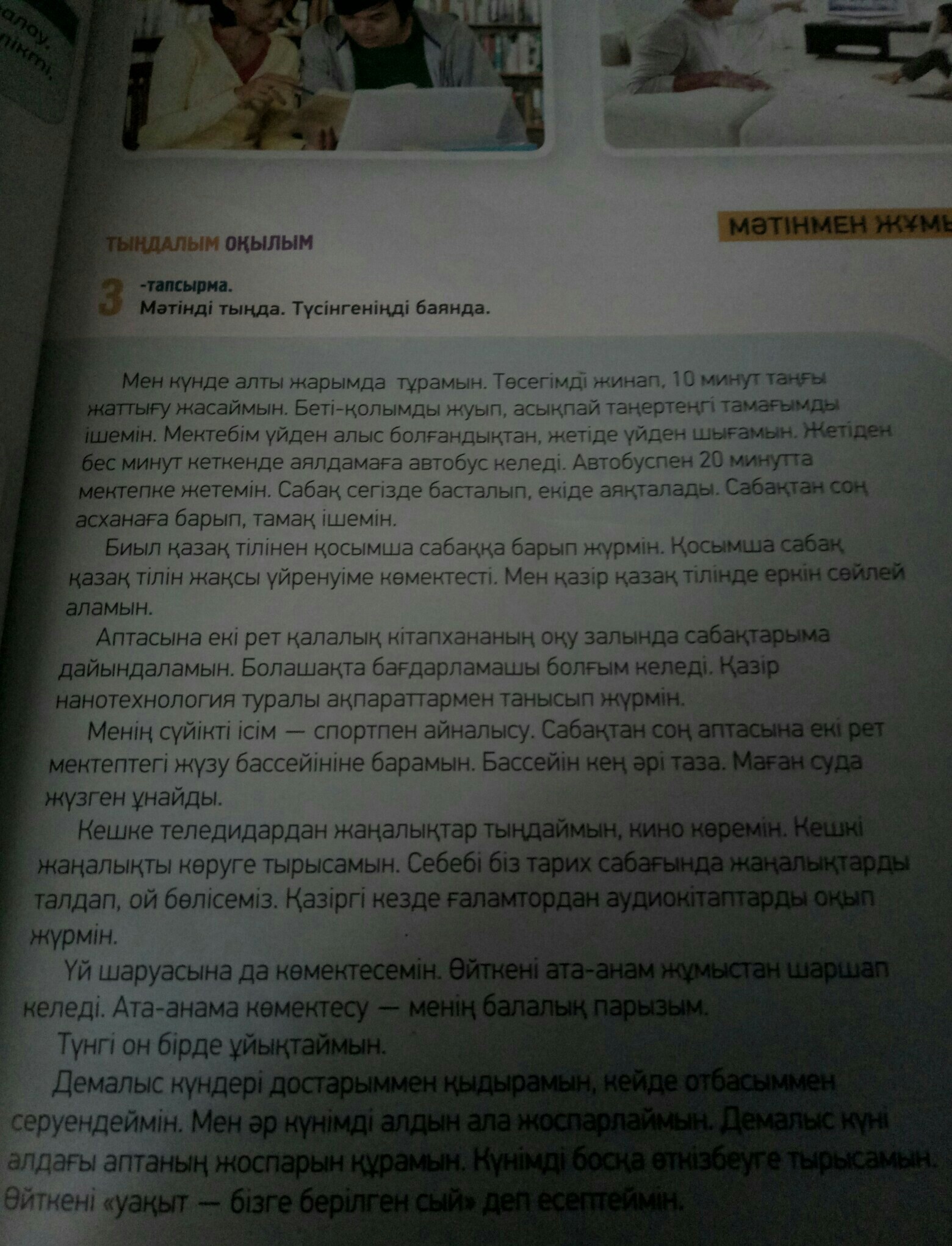 Я каждый день просыпаюсь в шесть тридцать.После того как убираю кровать делаю 10минутное упражнение.Так как моя школа долеко от дома я выхожу из дома в семь. В 7.05 к остоновке подезжает выучить казахский язык.