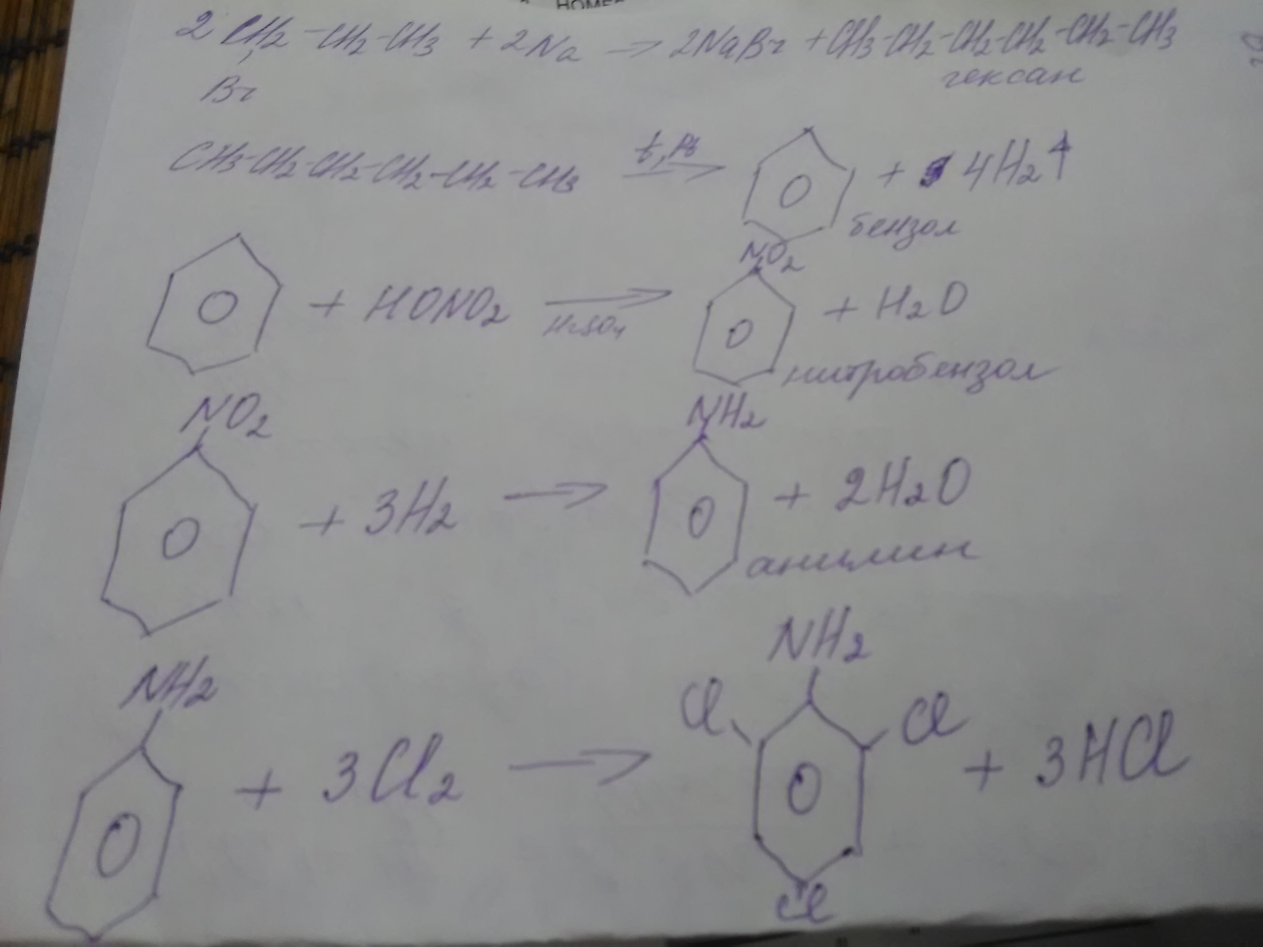 Напишите уравнения реакции по схеме: 1 - бромпропан - гексан - бензол - нитробензол - анилин - 2,4,6-трихлоранилин