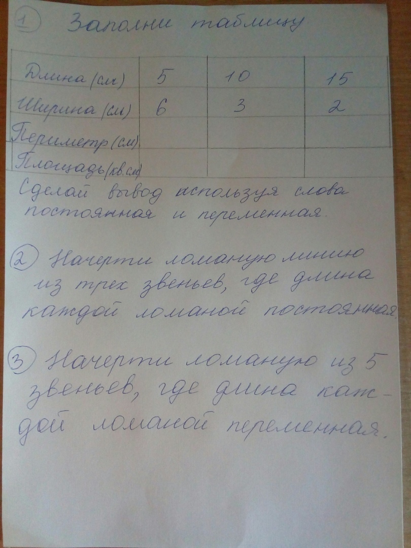 1) задание 5•6=30 это площадь 5+6•2=22 это периметр;10•3=30 это площадь 10+3•2=26 это периметр;15•2=30 это площадь 15+2•2=34 это периметр