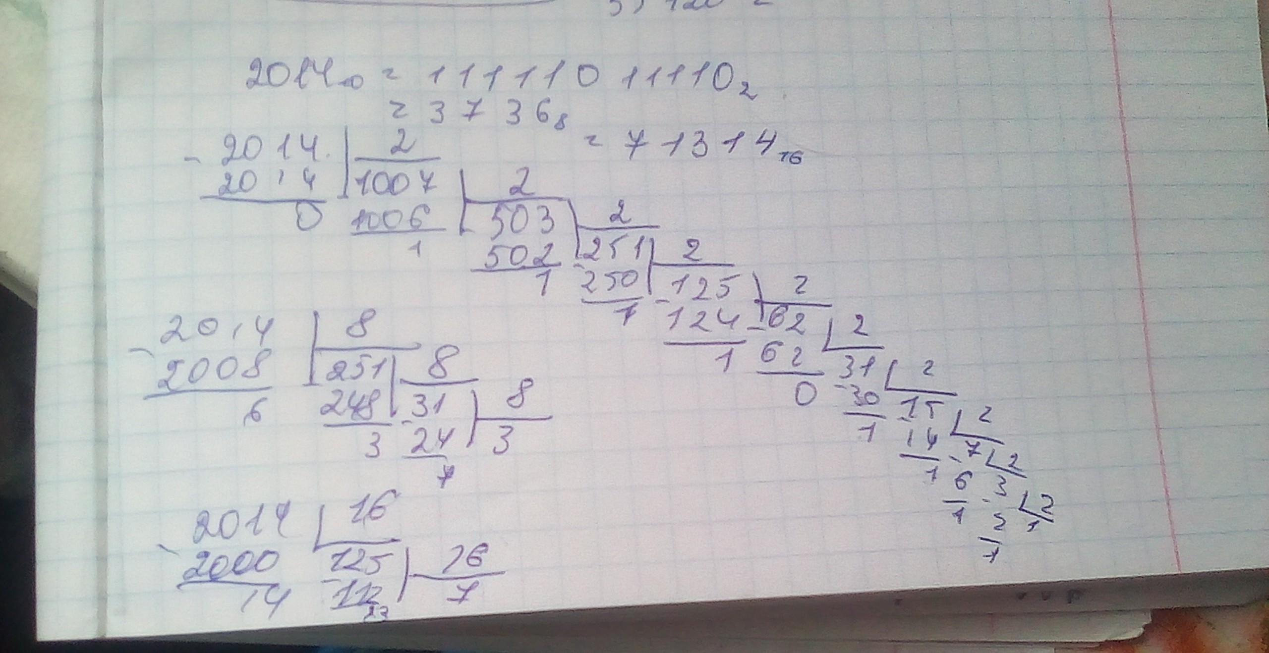 Переведите число 2014(в 10 степени ) в двоичную , восьмиричную , шестнадцатеричную системы счисления