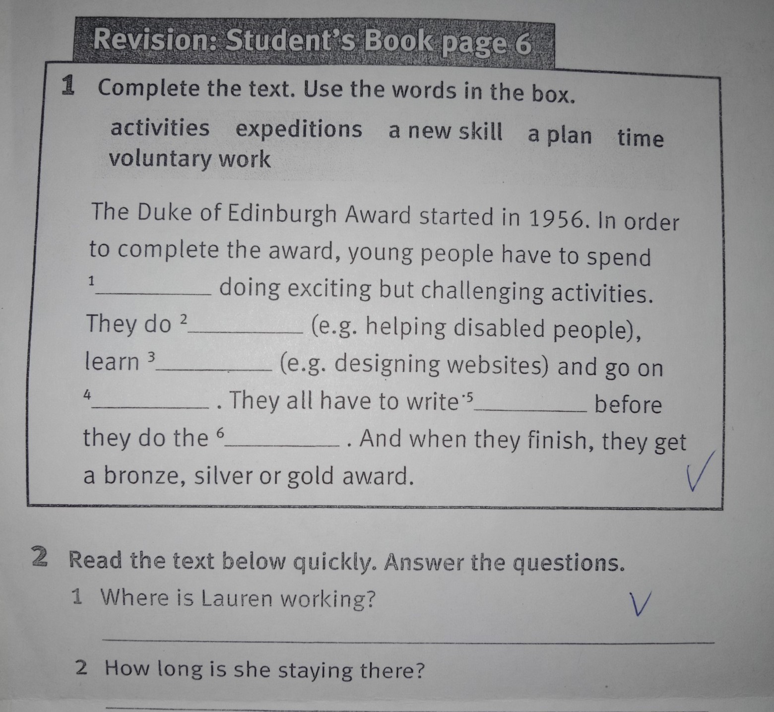 1 time 2 voluntary work 3 a new skill 4 expeditions 5 a plan 6 activities