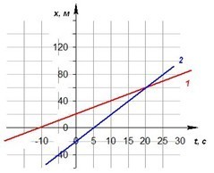 Графики движения двух тел представлены на рисунке. Написать уравнения движения x(t). Определить скорости тел.
