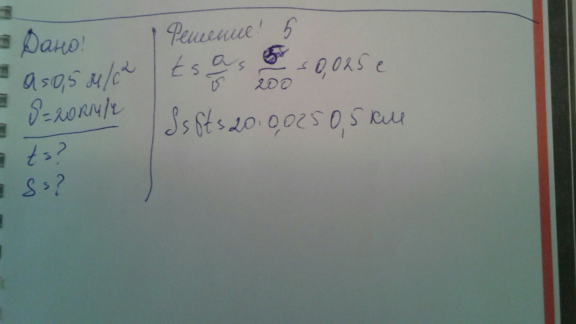 Тело начало движение из состояния покоя с ускорением 0,5 м/с*2. За какое время оно достигнет скорости 20 км/ч? Какой путь тело пройдет за это время?