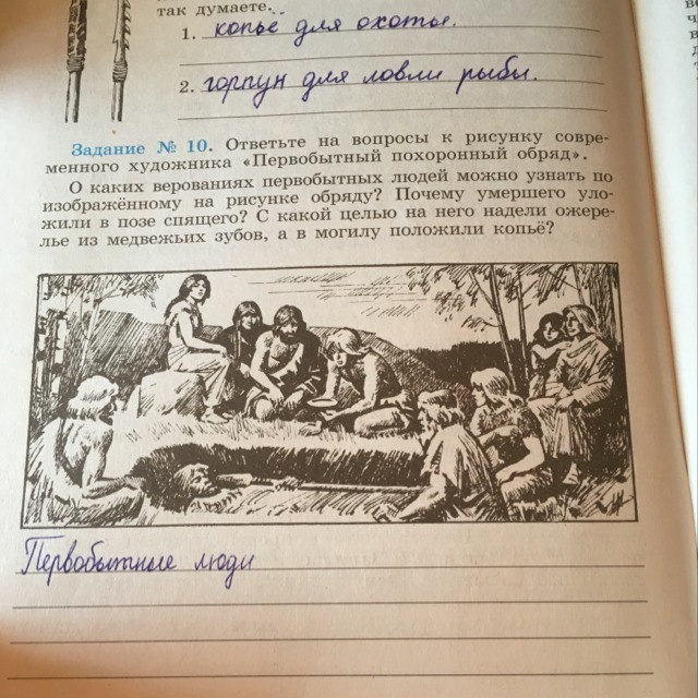 Человека хоронят в яме, в его обычной одежде, положив в могилу еду. Древние люди считали, что душа умершего продолжает вести ту жизнь, которую вел живший человек. Хоронили в позе спящего, вероятно, потому, что считали возможным возвращение души в тело и "пробуждение" мёртвого. Медвежье ожерелье являлось символом мужественного охотника, которому будет нужно копье для охоты в другом мире.