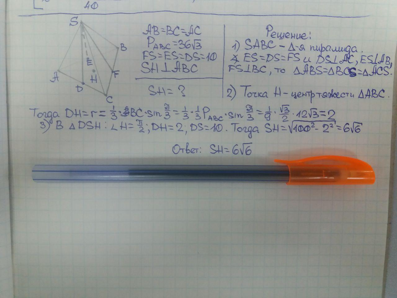 20 баллов! Периметр правильного треугольника =36корней3, а растояния от некоторой точки, которая не лежит в плоскости треугольника, к каждой из его сторон =10см. Чему равно растояние от этой точки к плоскости треугольника? решение с рисунком.