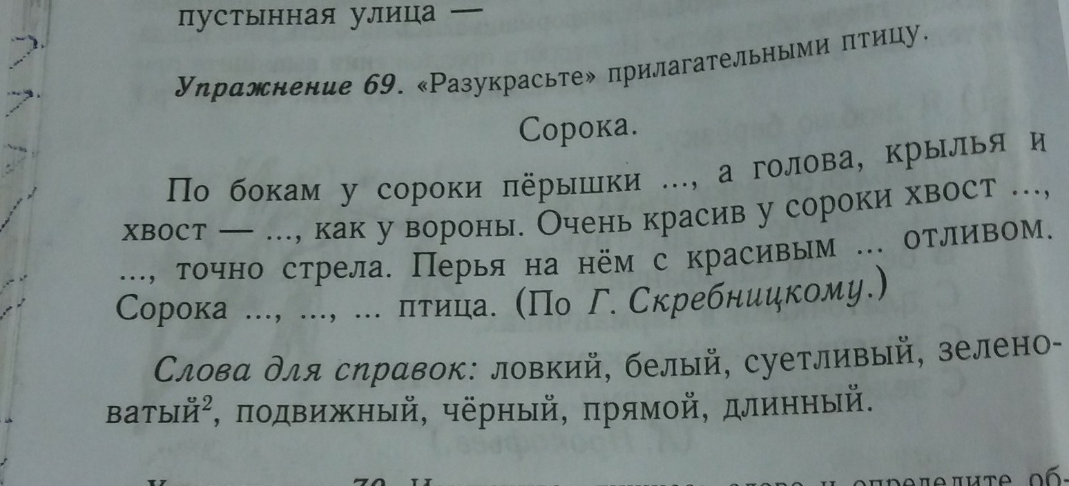 Белые, чёрные, длинный, прямой, зеленоватым, ловкая, суетливая, подвижная. Все слова вставить по очереди вместо....