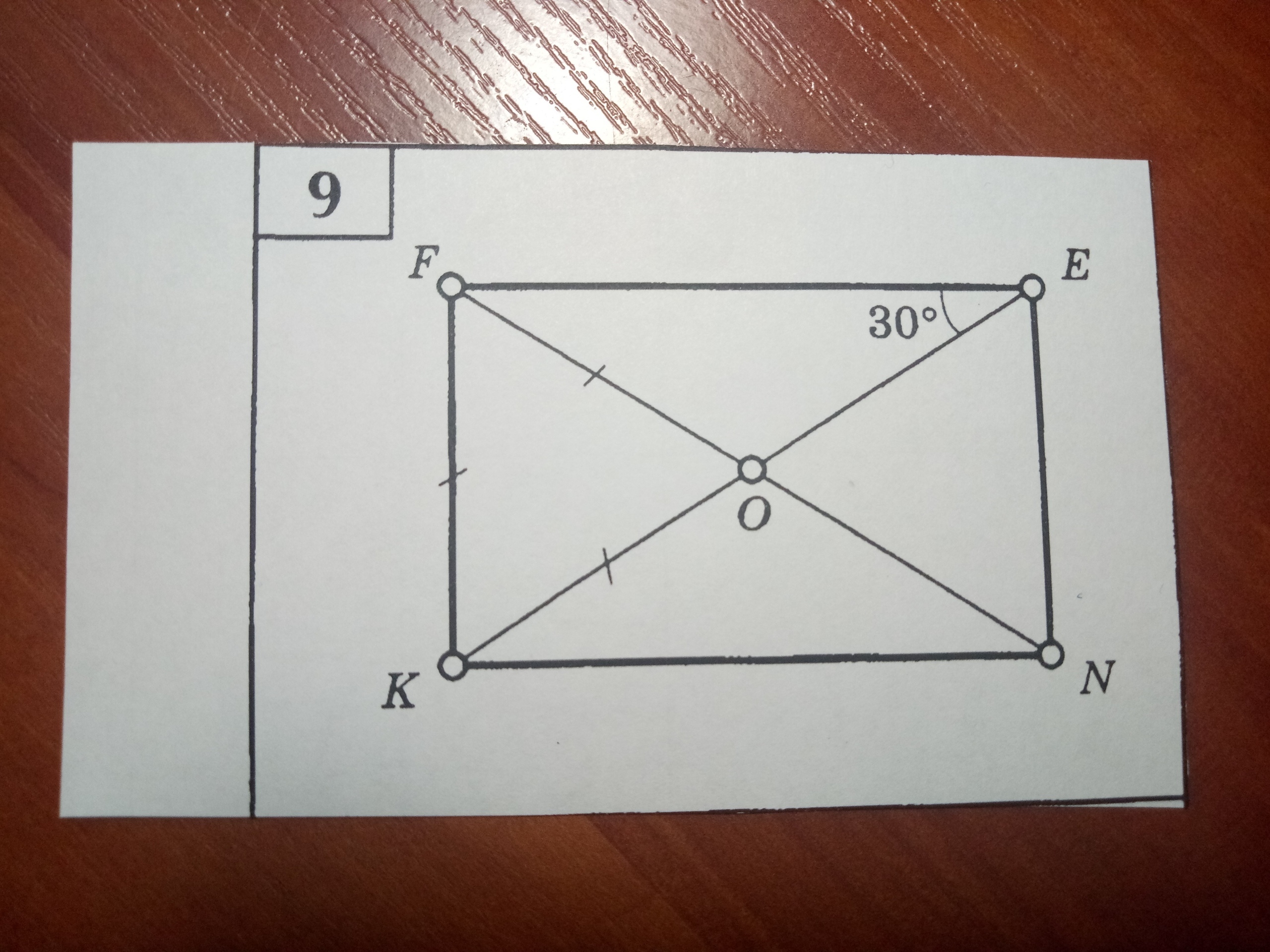 Треугольник KFO - равносторонний (по рисунку). Следовательно его углы равны по 60°. <FKO (<FKE) = 60°. Так как KFEN параллелограмм, то KF параллельна EN (противоположные стороны параллелограмма). Следовательно <FKE=<KEN=60° как накрест лежащие при параллельных KF и EN и секущей КЕ. <FEK=30° (дано). <FEN=<FEK+<KEN = 30°+60°=90°. Если в параллелограмме один из углов равен 90°, этот параллелограмм - прямоугольник и все его углы равны по 90°.