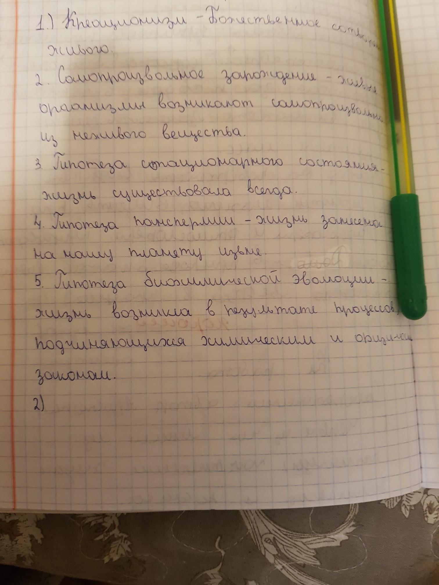 1 Назовите гипотезы происхождения жизни на земле. 2. Какие закономерности лежат в основе биохимической эволюции? Кому принадлежит данная теория? Какая Какие условия были необходимы для биохимической эволюции? Что является природной среды для человека? Что означает социальная среда для человека? Техногенная среда жизни-это...